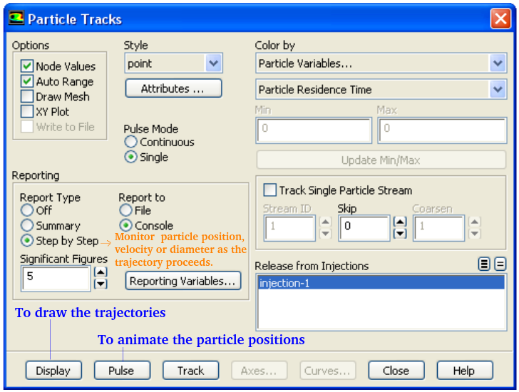 Trajectory Fates: Shed trajectories are newly generated particles during the breakup of a larger droplet and appear only if a breakup model is enabled. Coalesced trajectories are removed particles which have coalesced after particle-particle collisions and appear only if the coalescence model is enabled. Splashed trajectories are particles which are newly generated when a particle touches a wall-film. Those trajectories appear only if the wall-film model is enabled.