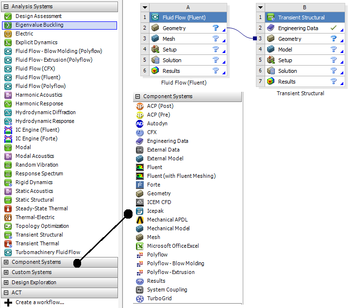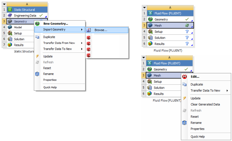 Step-01: Open "Fluid Flow (Fluent)" from Analysis Systems branch in Workbench. This will create a FLUENT simulation tree containing Geometry, Mesh, Solution and Results branches. You can also 'Import' a Case and Data file created out of Workbench. This will automatically delete Geometry and Mesh tabs (branches). When a parameter is defined in ANSYS SpaceClaim or Discovery, the Parameters tab and "Parameters Set" branch get added to the project schematic.